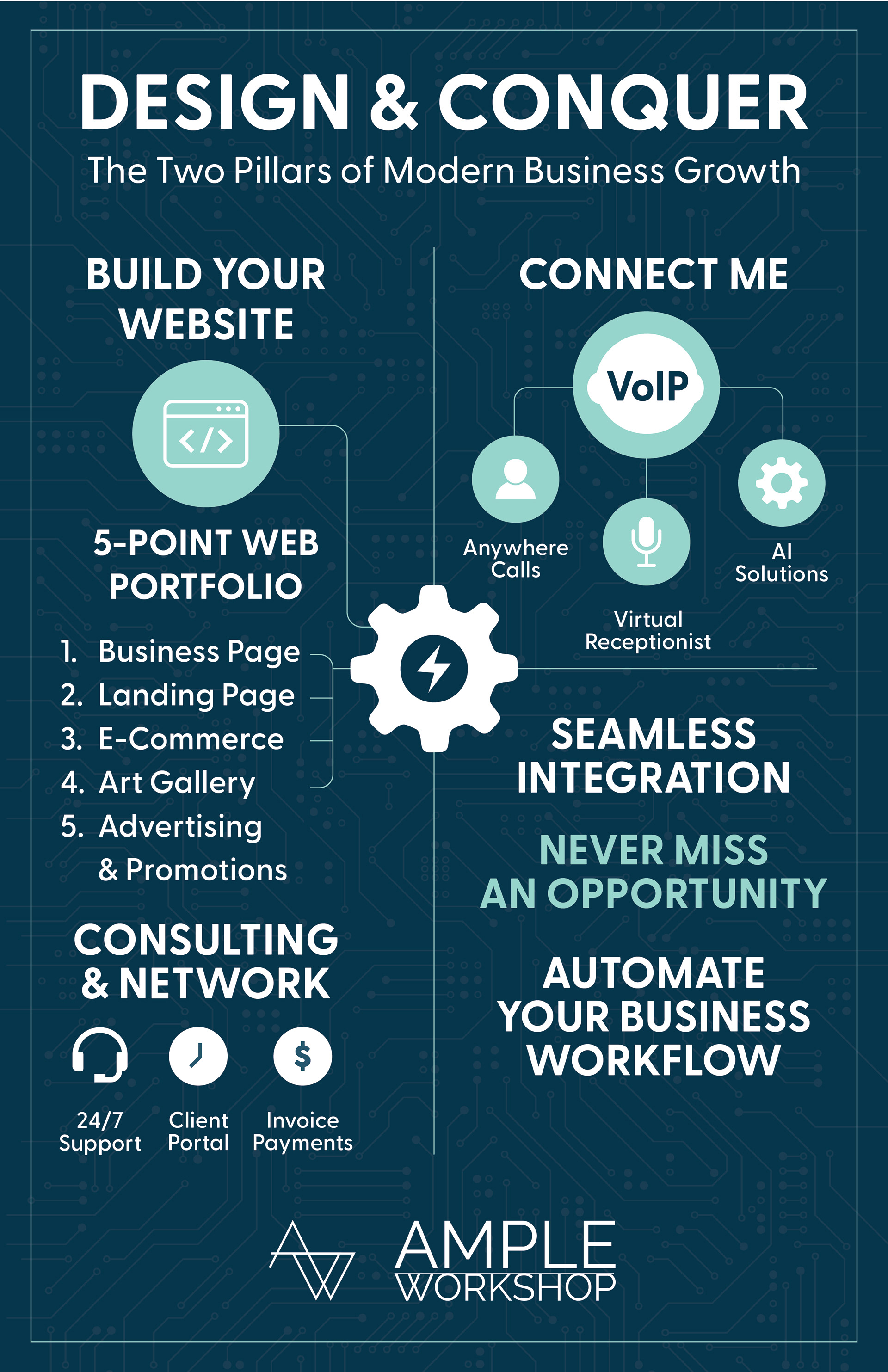 A clean, vector-based infographic designed in Adobe Illustrator for flexible use across web and social media. The layout highlights Ample Workshop’s core services with clear, modern visuals that stay sharp in any format, supporting consistent and high-impact digital promotion.