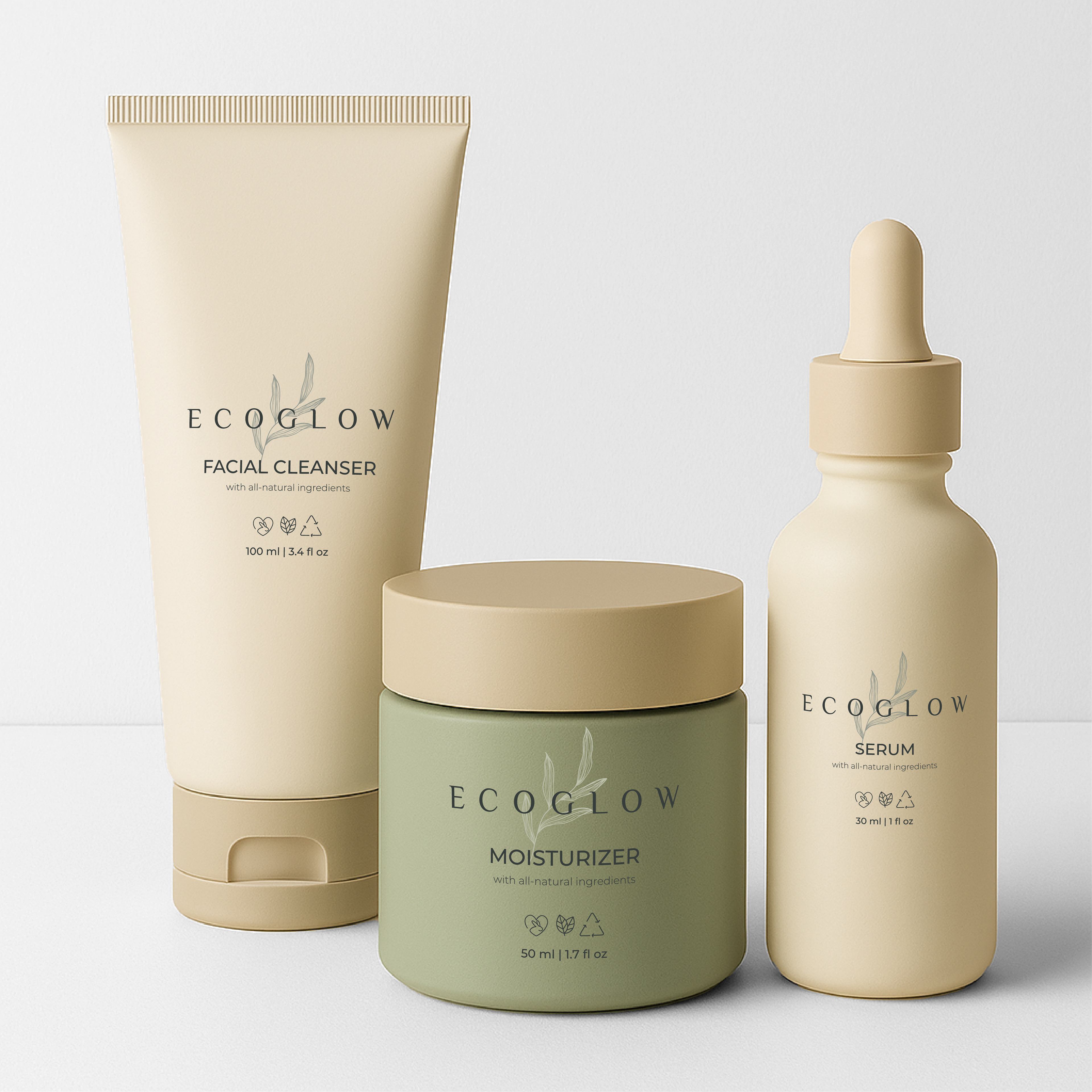 Modern, eco-conscious cosmetic packaging for EcoGlow, a sustainable skincare brand, designed in Adobe Photoshop from an AI-generated prompt, with a focus on clean design, cohesive branding, and natural aesthetics.
