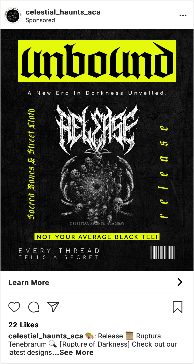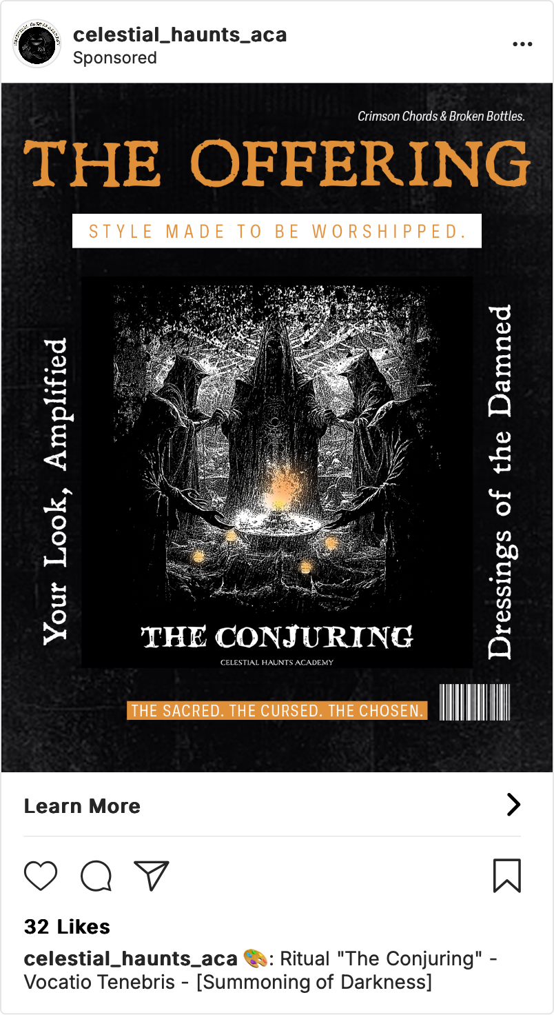 Social media graphics created in Adobe Photoshop for Sparkle in Pink and Celestial Haunts Academy, both eCommerce clothing brands. The work is designed for B2C audiences with visually engaging layouts, cohesive branding, and strong digital engagement, including Instagram posts for the Celestial Haunts Academy Fall 2025 T-shirt line that use a magazine-cover style to spotlight the collection’s artwork and give the brand an editorial feel.